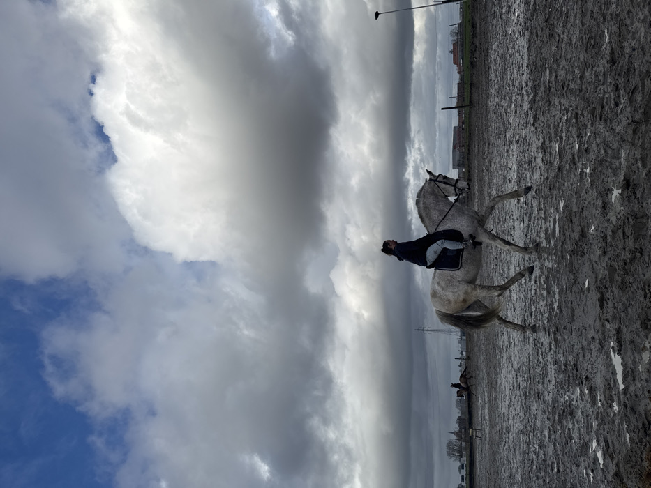 The image depicts an outdoor equestrian scene in Estaimpuis, Belgium. A female rider, wearing a dark hooded garment and light-colored trousers, is mounted on a dapple-grey horse equipped with a dark saddle and bridle. The horse is in mid-stride, moving from left to right across a heavily muddy, unpaved ground surface marked by numerous puddles. In the background to the left, two additional horses are observed moving. A light-colored chair is positioned in the mid-ground. The distant background on the left horizon includes a faint building with a spire, a line of trees, and a prominent metal electricity pylon. On the right, a tall dark pole extends vertically from the ground, and several red-roofed structures are visible. The sky is predominantly covered by a layer of dense, dark grey clouds, with patches of bright blue sky visible in the upper left quadrant.