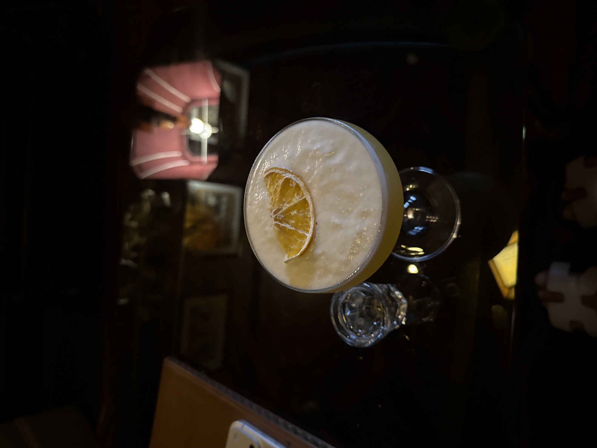 cocktail on a dark, reflective surface, likely a table. The cocktail is topped with a slice of dried citrus, possibly orange or lemon. There's a small glass with what appears to be ice and a stemmed cocktail glass next to it. In the background, there's a blurred lamp with a pink and white striped shade. The location is unknown and not discernable from the image alone. There is no information to suggest the city of Cape Town, South Africa, or any details about people or actions. The environment appears to be dimly lit, possibly a bar or restaurant.