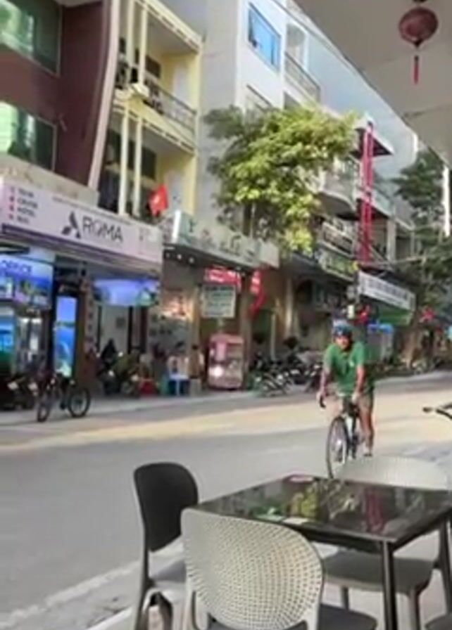 cyclist riding down a street in Vietnam. The cyclist is wearing a helmet and a green shirt. He is riding on a paved road alongside several parked motorbikes and cars. Behind the cyclist are several buildings with shopfronts and apartments. The camera is fixed and at an angle capturing the street from under an awning of a cafe. The cafe has a table and chairs in the foreground. A red backpack rests on one of the chairs. There is a Vietnamese flag hanging from one of the buildings. The weather appears sunny. The overall impression is of a typical busy street scene in Vietnam.