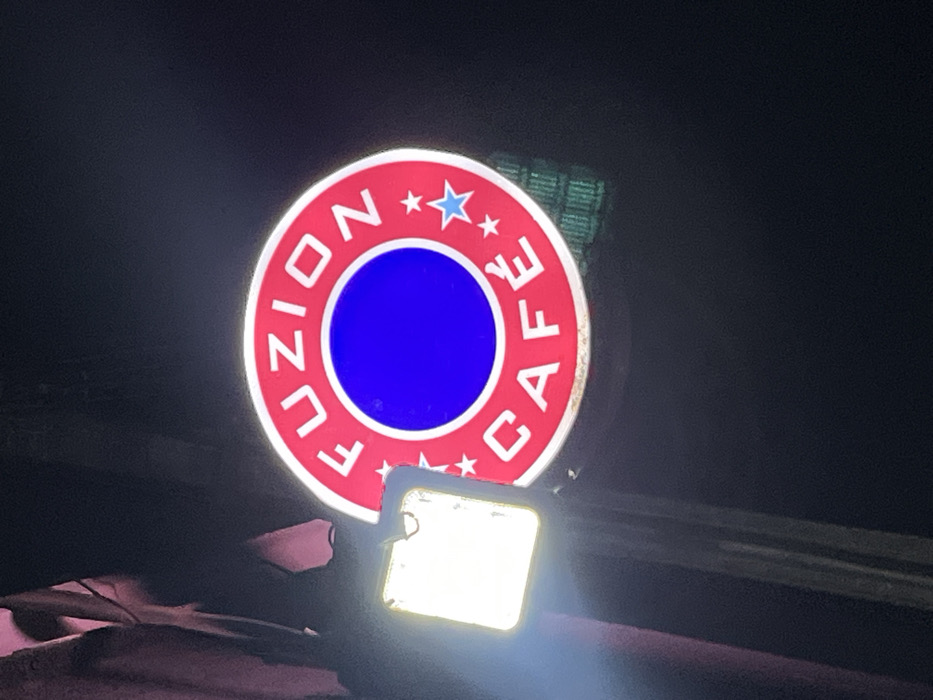 A circular sign with "FUZION CAFE" around the perimeter in white letters and small white stars, all against a red background