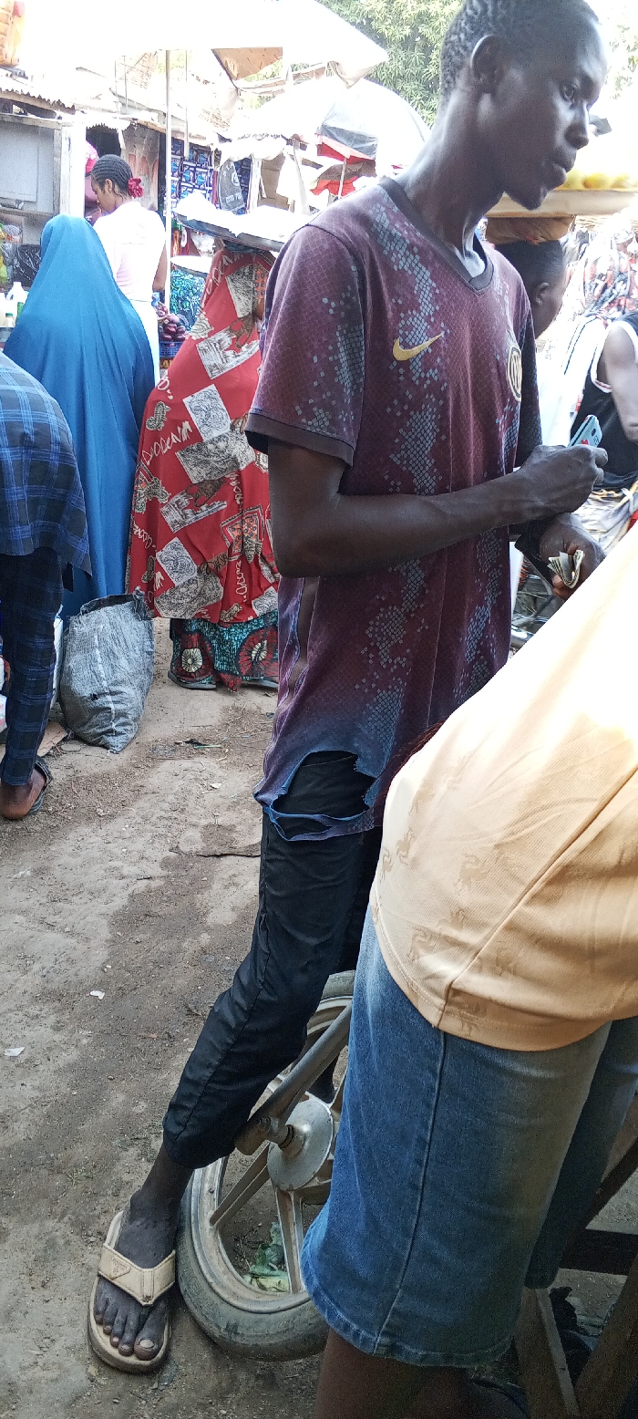 This image captures a street scene in Nassarawa, Nigeria, likely within a bustling outdoor market area. The foreground is dominated by three individuals. A dark-skinned adult male stands prominently in the center, facing partially to the right. He wears a maroon short-sleeved t-shirt with a subtle scale-like pattern, a yellow Nike swoosh on the right chest, and an emblem (possibly a club crest) on the left. The shirt has visible tears near the left armpit. He is dressed in dark-colored, form-fitting trousers with a tear on the left thigh, exposing the skin beneath. His feet are bare, wearing light beige flip-flops. His right hand holds a smartphone, while his left hand clutches folded currency. He leans against the exposed metal wheel and frame of what appears to be a motorcycle or bicycle. To his immediate right, partially visible from the mid-torso down, is another person wearing a light tan shirt with a repeating, faint pattern and blue denim shorts. To the central male's left, partially visible from the waist down, is a third individual in a blue plaid shirt and dark trousers, with brown sandals on their bare feet. A grey, possibly burlap, sack rests on the ground near their feet. The ground is unpaved, appearing as compacted dirt with small debris. In the midground, several other individuals are present. A person in a solid blue, full-body garment (possibly a hijab) stands with their back to the camera on the left. Next to them, another person wears a red garment with white patterned fabric, also facing away. Further right, behind the central male, another individual carries a flat tray of light yellow items (possibly fruit) balanced on their head. The background reveals a series of rudimentary market stalls constructed from corrugated metal sheets, wooden supports, and white tarpaulins or umbrellas for shade. Various goods, including bottles and packaged items, are visible within these stalls. Trees and diffuse daylight are present in the upper background. The overall impression is one of a busy, outdoor commercial environment with multiple people engaged in activity.