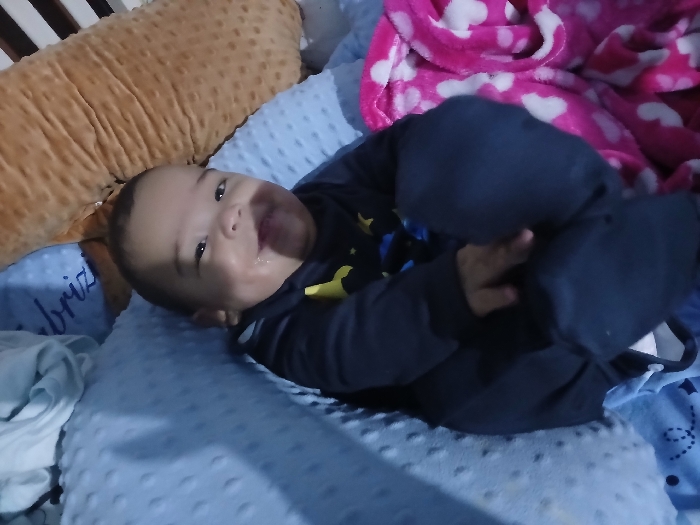 A baby is depicted lying on its back, partially propped up, in what appears to be a crib or bed. The baby, with dark hair and eyes, possesses light-to-medium brown skin and displays a wide smile or grin, with evident moisture around the mouth area. The baby wears a dark blue long-sleeved garment adorned with yellow star-like patterns and dark blue pants. The left hand is positioned near the left leg. The immediate environment includes a light blue, textured blanket with small raised dots covering the surface beneath the baby. To the right of the baby's head is a textured brown pillow or cushion, and a pink blanket with white heart patterns is visible in the lower right portion of the frame. A blue fabric with white embroidered text, partially obscured but resembling "briz," is visible behind the baby's head on the light blue bedding. A vertical wooden slat, suggestive of a crib railing, is visible behind the brown pillow. The scene is indoors; however, the specific location within the city of Juan Griego, Venezuela, cannot be determined from the visual information provided.