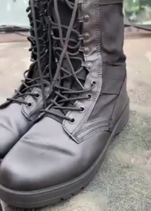 - "Two black combat boots with laces rest on a surface, presumably a vehicle hood given the windshield's edge in the background" by FM-Ff9pr2, licensed under CC BY 4.0