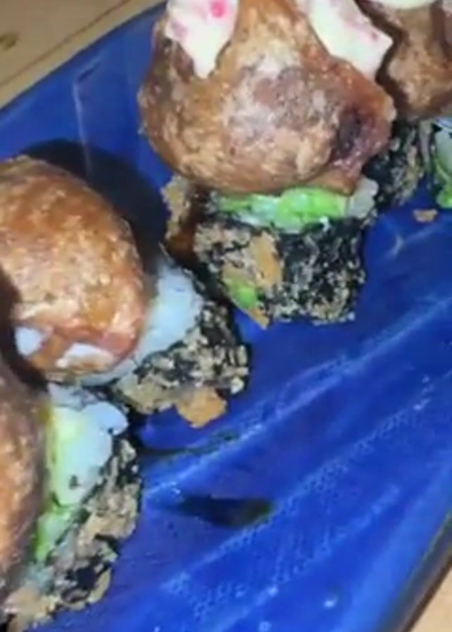 close-up of a blue plate with pieces of sushi. Each piece of sushi is topped with what appears to be fried food and a white creamy sauce with red dots. The sushi itself is wrapped in what looks like seaweed, and there seems to be avocado between the seaweed and the fried topping. There is a dark sauce drizzled on the plate. The plate is sitting on a wooden table, and the lighting seems to be indoor lighting. The camera moves slightly.
