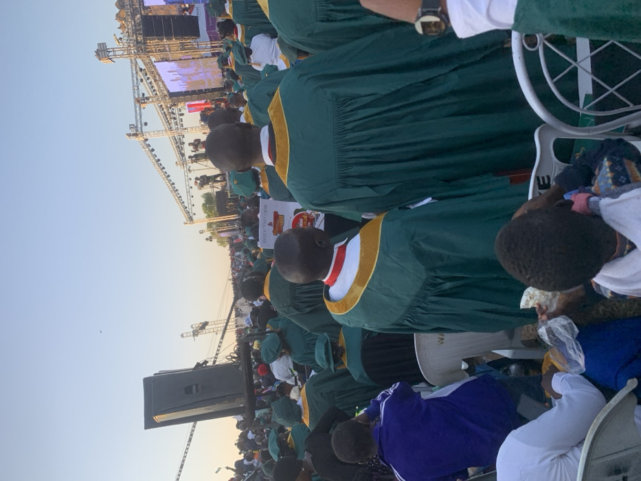 A large crowd of people wearing green gowns with gold and white trim sit in rows. A stage with lighting equipment and a large screen sits in the background. The angle suggests the photo was taken from within the crowd. A person wearing a white shirt with a watch is visible in the foreground. Some individuals appear to be standing or moving in the back of the crowd. The sky is a clear blue.