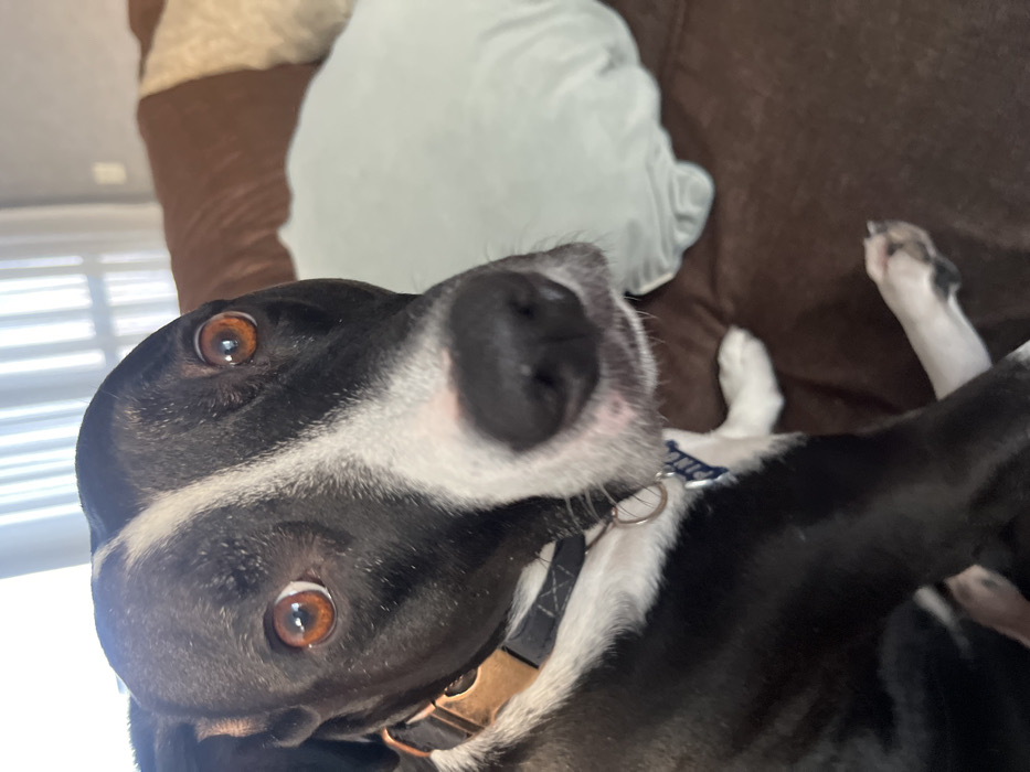 A black and white dog with brown eyes stares inquisitively towards the camera. The dog is lying down on a brown couch with a light blue pillow in the background. A black collar with a silver buckle and a small blue patterned tag is visible around the dog's neck. The dog’s nose is large and shiny black. The head is tilted in a way that gives the dog a curious expression.