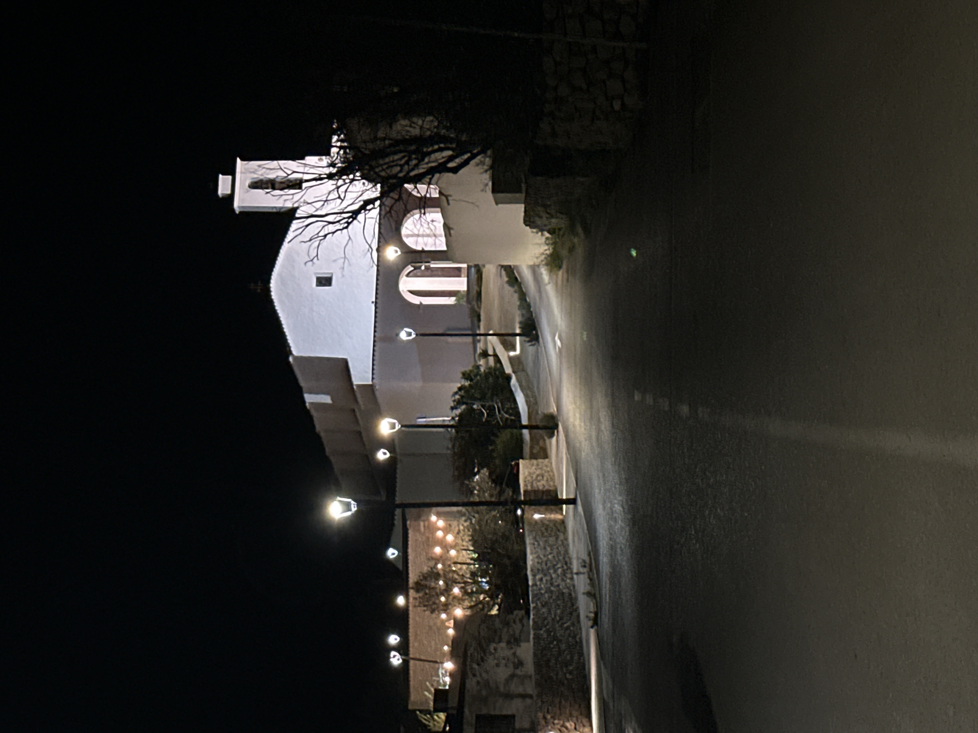 At night in Sant Antoni de Portmany, Spain, the camera looks down a road. The road is dark and wet, reflecting light. Streetlights illuminate the road and a white building on the left. The building has arched windows and doorways, with a bell tower visible at the top. Trees and bushes grow alongside the building. String lights are hung in the lower right. The sky is dark, and the overall atmosphere is calm.