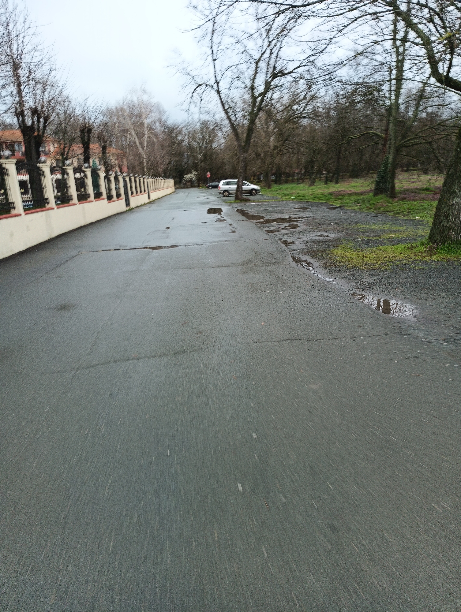 street scene, likely in the city of Karnobat, Bulgaria. The road appears wet with puddles, and a light-colored vehicle is parked on the side of the road further down. To the left, a cream-colored wall with a dark metal fence runs along the street. Beyond the road to the right, there's an area with trees and some green grass. The sky is overcast. There's no presence of people in the image.