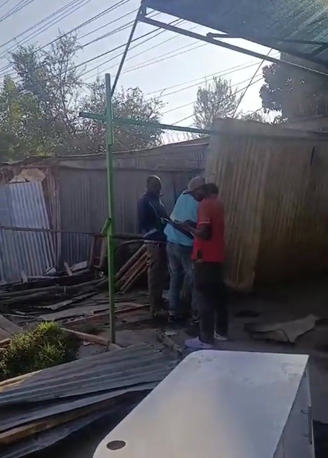 what appears to be the aftermath of a demolition or destruction event, with debris scattered along a street. The debris includes corrugated metal sheets, wooden planks, and other materials. Several men are standing near the debris, looking at their phones and conversing. In the background, there are small structures made of corrugated metal, and a power line runs above the scene. The sky is clear, and the lighting suggests it is daytime.