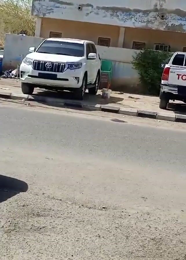 The scene unfolds on a sunny day along a street near a multi-story building. The building has a weathered facade with visible air conditioning units and several barred windows. Parked along the curb are a white Toyota Land Cruiser, a white Toyota pickup truck, and a white Toyota sedan. A man wearing a blue shirt exits the pickup truck. Subsequently, a man wearing a black shirt and gray pants walks along the sidewalk while talking on his cell phone. Another silver sedan drives into frame, following the other white car.