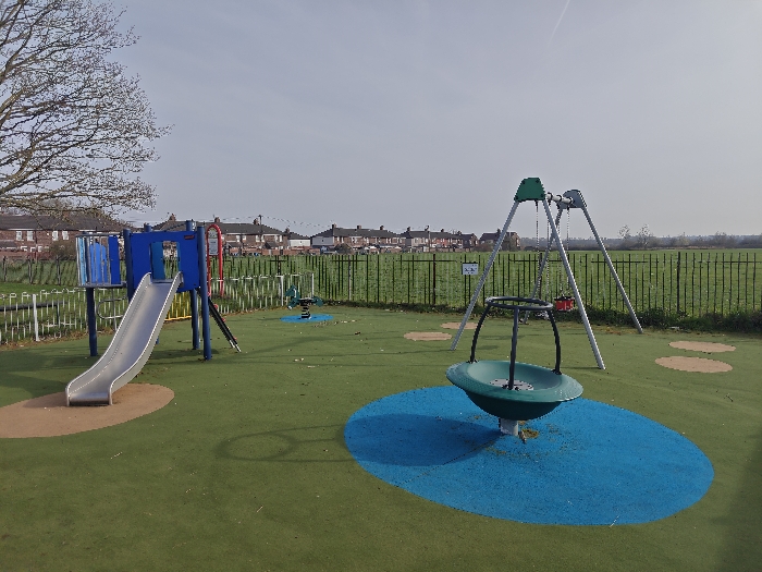 The image depicts an unoccupied children's playground situated within Victoria Park, Whelley, Wigan, United Kingdom