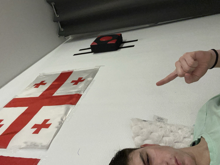 A person pointing upwards towards a white wall with a Georgian flag taped to the left side