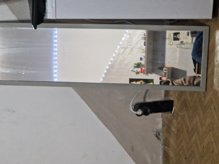 This image depicts an indoor scene within a residence in Troyan, Bulgaria. The foreground features a light brown wooden parquet floor and a white wall with visible wear, scuffs, and minor damage near its base, partially obscured by a diagonal shadow. A black object, possibly a power strip or small speaker, is plugged into an electrical outlet on this wall, with a white cable extending upwards. A tall, rectangular full-length mirror with a light gray frame stands on the floor, positioned centrally. The mirror reflects a portion of an adjacent room. The reflection shows a white wall adorned with a horizontal string of bright LED fairy lights at the upper section, with more lights seemingly draped downwards. Below this, a light-colored wall-mounted shelf holds various small objects, including plants, bottles, and a red and white container. Further down, a person is partially visible, seated or reclining, wearing a beige or light brown hooded garment and blue trousers. A clear glass bottle rests on a surface next to them, and a poster or sheet of paper with black text and graphics is affixed to the wall behind. To the far right of the frame, a large white appliance, possibly a refrigerator or cabinet, is partially visible.