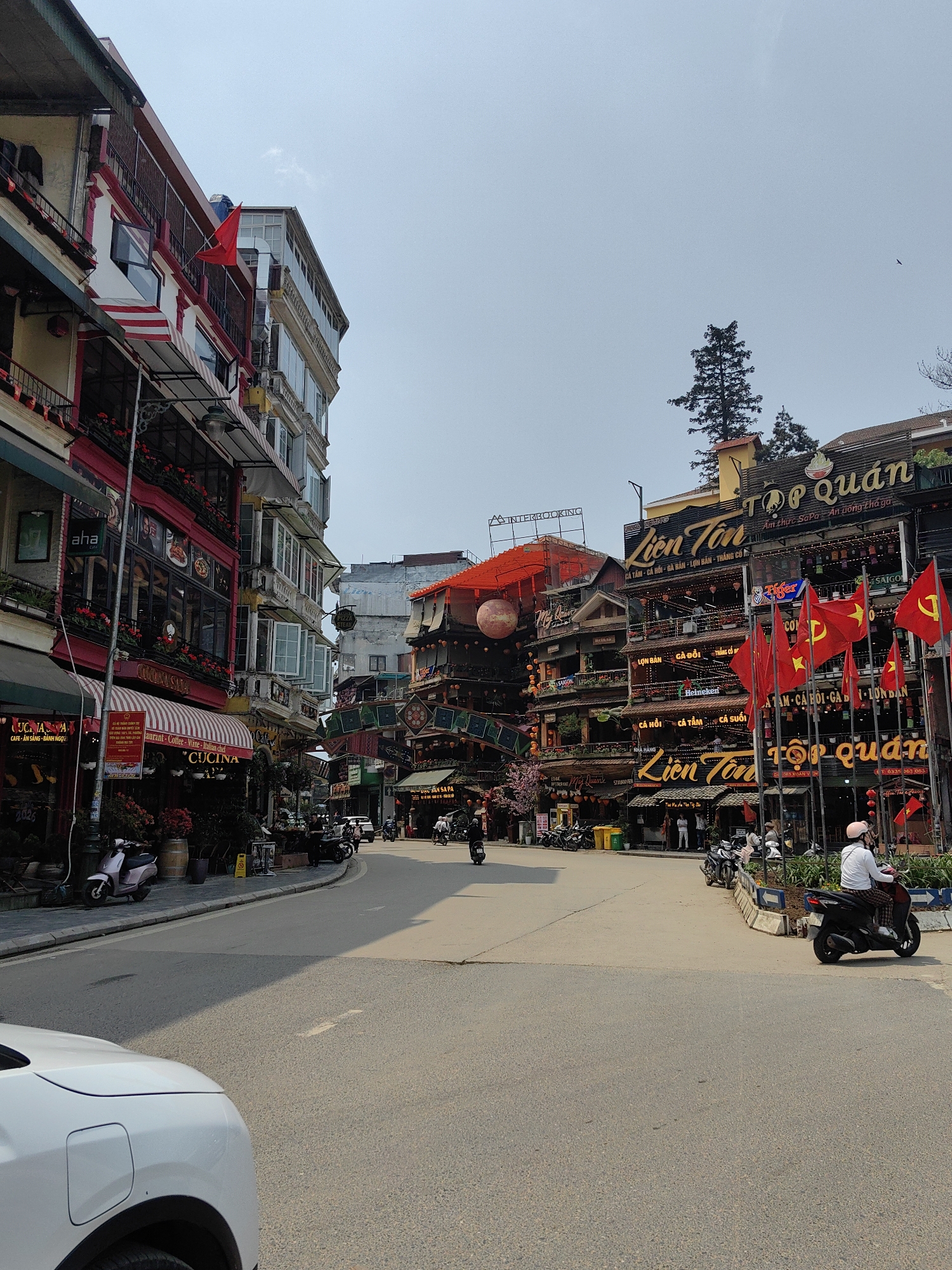 The image depicts an urban street scene in Sa Pa, Vietnam, observed from a low-angle perspective