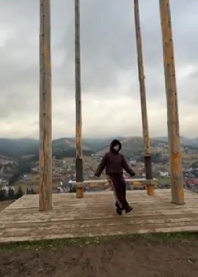 young woman sitting on a swing set overlooking a small town in the mountains. The woman is wearing a dark brown puffer jacket and pants and a black beanie. The swing set is made of wood and has four large wooden posts. The platform the swing sits on is also wooden. The town below has many houses and buildings, and the mountains are covered in trees. The sky is cloudy and overcast.