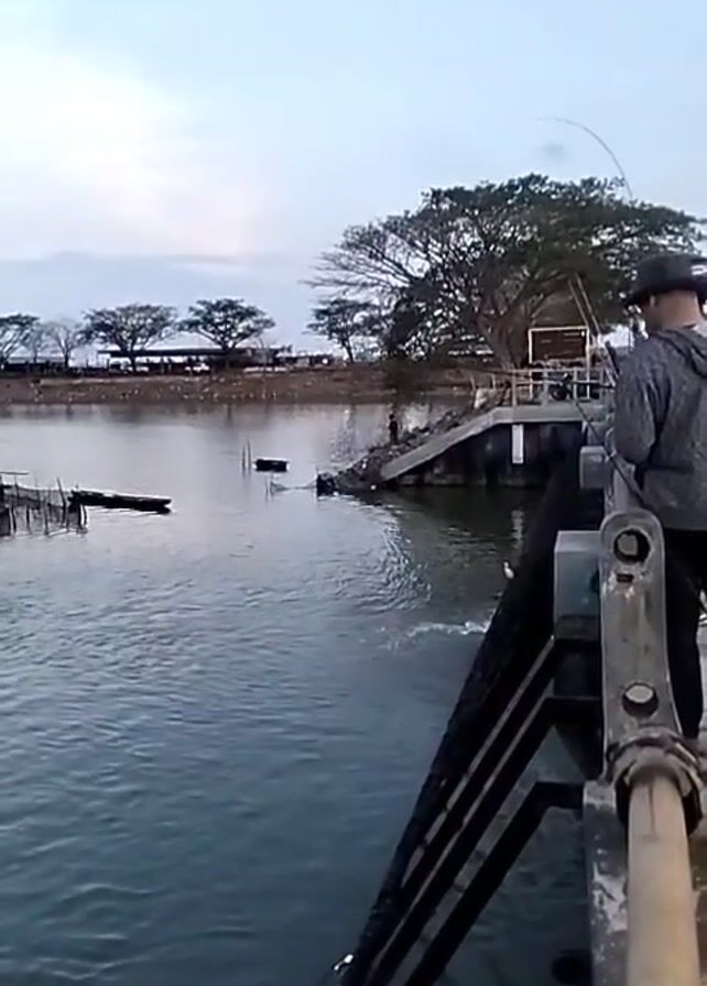 fisherman standing on a metal structure next to a body of water. The fisherman is facing away from the camera, wearing a gray jacket and a hat. He is holding a fishing rod, and the line is cast into the water. In the background, there is a grassy shoreline with trees. There is a small pier with stairs leading down to the water. On the water, there are some small black objects. The sky is overcast. The camera is positioned on the metal structure, looking out over the water. The video appears to be taken during the day, but the light is dim.