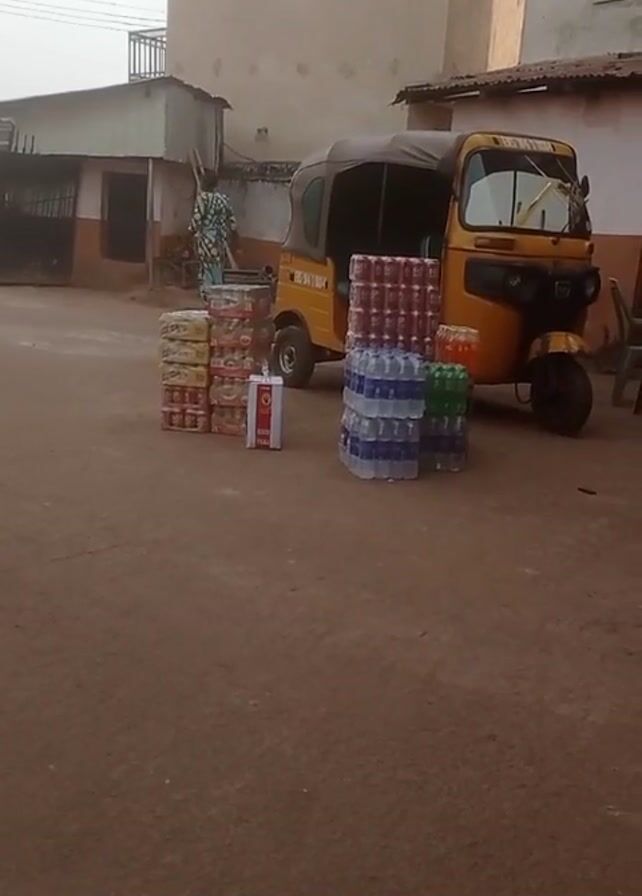 A yellow three-wheeled vehicle, possibly a tuk-tuk, is parked on a dirt-covered street. Stacks of bottled drinks and boxed goods are arranged beside it. A woman in a patterned dress walks from behind the vehicle, approaching the left side of the frame. Buildings are visible in the background, including a two-story structure and a smaller shed-like building. The sky is overcast.