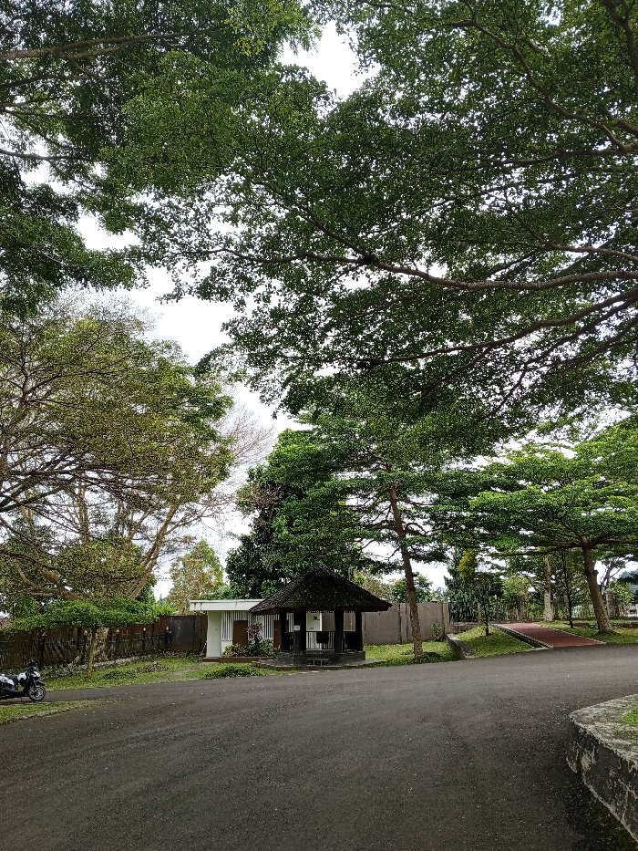 The image depicts a verdant outdoor environment in Catarman, Philippines, under an overcast sky partially visible through a dense canopy of green tree leaves that dominates the upper frame. A dark asphalt road, devoid of markings, curves from the lower foreground towards the mid-ground. To the left of the road, a black motorcycle is parked on a grassy verge adjacent to a low, dark-colored fence or wall. In the central mid-ground, an open-sided gazebo with a dark, possibly thatched, roof and dark supports is situated. Immediately to its left and slightly behind it stands a small, white, rectangular utility building featuring vertical siding and a single entrance. To the right of the asphalt road, a distinct red-paved path runs parallel, leading into the background. The area is characterized by lush green foliage, including various mature trees with different leaf densities and ground-level grass. No individuals or active subjects are discernible within the frame.
