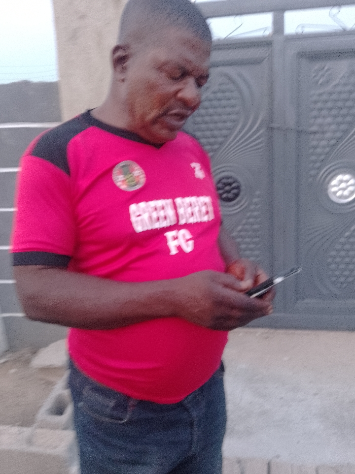 A single adult male subject stands outdoors in the city of Unknown, Unknown. The man, appearing middle-aged with dark skin, short graying hair, and a mustache, is wearing a pink short-sleeved shirt with black shoulders and cuffs. The shirt displays a circular emblem on the left chest and white text reading "GREEN BERET FC". He is also wearing blue denim jeans. His head is tilted downward as he holds a black smartphone with a silver edge in both hands, focusing his attention on the device. In the background, to the subject's right, is a dark gray metal gate featuring decorative circular and curvilinear patterns. To the subject's left, a light-colored wall segment is visible, and several concrete blocks rest on the light-toned ground surface.