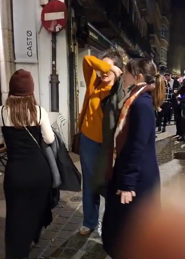 n outdoor scene, possibly a street at night, with several people visible. The video opens with three women in the foreground. The woman closest to the camera is wearing a black dress and a brown beanie, carrying a gray jacket. The woman in the middle is wearing an orange sweater and jeans. The woman on the right wears a navy blue coat and a patterned scarf. They appear to be on a sidewalk. There is a sign that reads “CASTØ” visible on a white building. In the background, there is a larger group of people, some of whom are dressed in costumes. A man in a green puffer jacket walks in front of the camera, briefly obscuring the view. The overall environment seems urban and lively. There is music playing in the background.