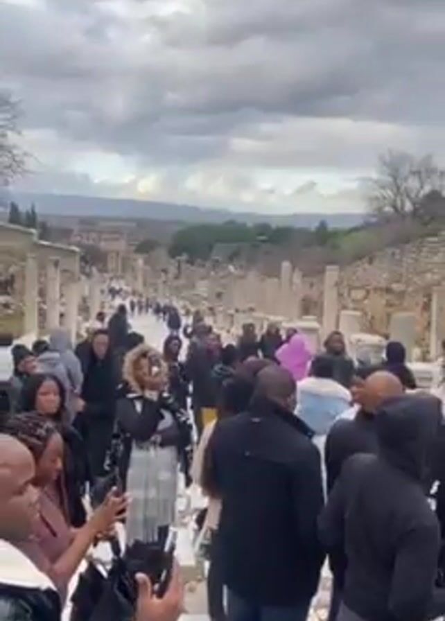 The video depicts a large group of people walking along a cobblestone pathway lined with ruins, presumably an ancient city or historical site