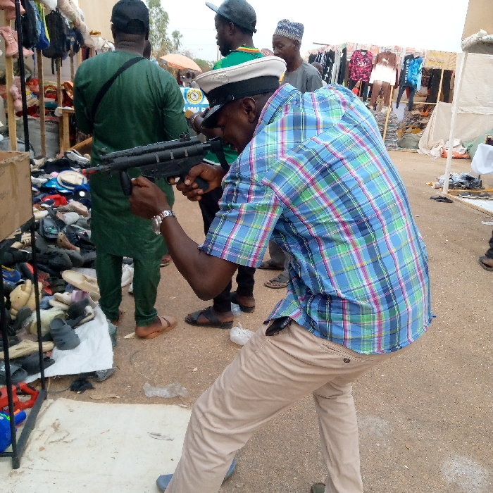 A man in a white and green hat and plaid shirt holds a toy gun. He is aiming towards the viewer, slightly crouched, with tan pants and a watch on his left wrist. Other people are in the background, along with clothing and shoes being sold. The scene appears to be an outdoor market or bazaar. The man with the gun is the primary focus, suggesting he might be posing or demonstrating something.
