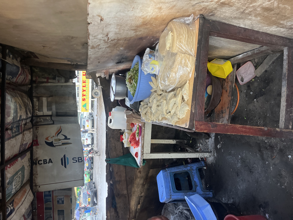 This image depicts the interior of a rustic, makeshift street food stall in Nkaimurunya ward, Kenya, with a view of an urban street beyond