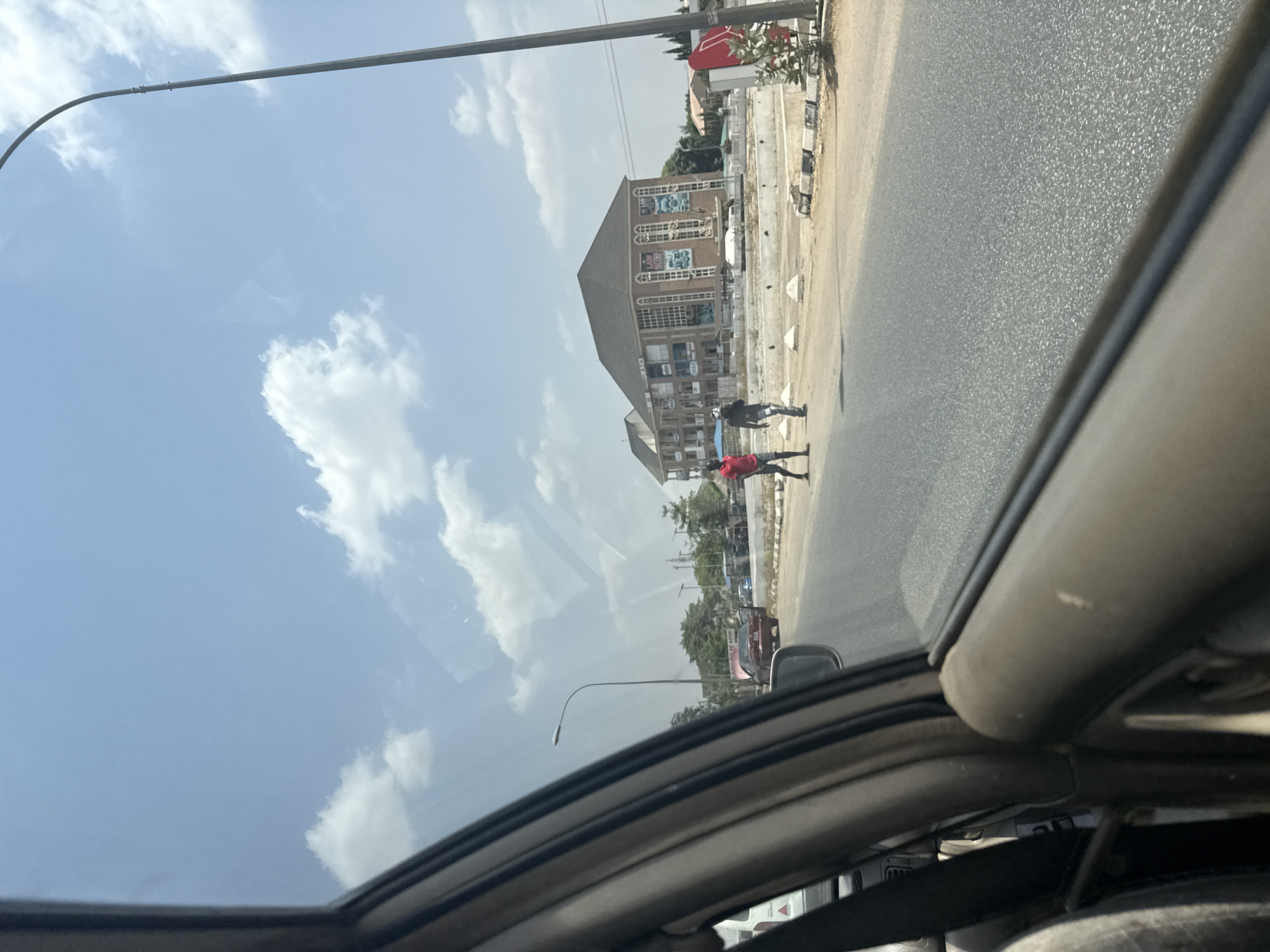 This image captures an exterior street scene in Gwarinpa, Nigeria, observed from inside a vehicle, with its interior door frame and window pillar visible on the left and bottom