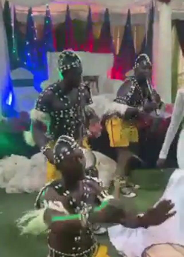 wedding reception with traditional Nigerian dancers, a bride, and wedding guests. The bride is wearing a white, lace-sleeved mermaid-style gown and has her hair styled up. Three male dancers are dressed in traditional clothing, including beaded headbands, beaded chest coverings, yellow shorts, and white armbands with feathers. One dancer is playing a drum, while another is singing into a microphone. An older man in traditional Nigerian attire is offering the bride money. The reception is decorated with white drapes, floral arrangements, and green and blue lighting.