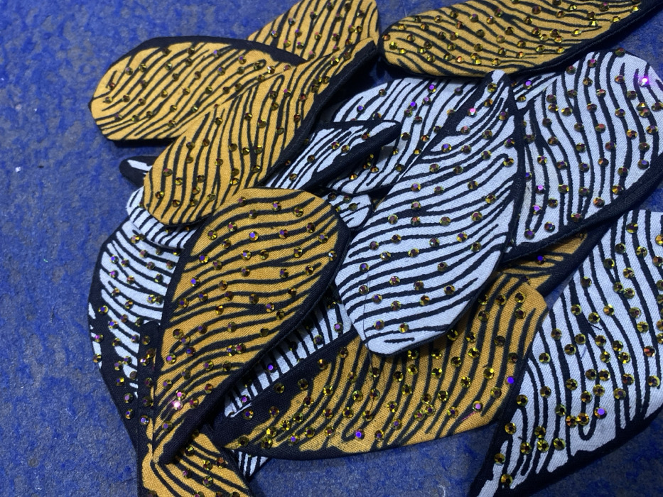Several leaf-shaped fabric pieces with zebra-like stripes fill the frame. Some pieces have a golden-yellow base, while others are white. Black stripes run across each piece. Small, reflective gems are attached, adding sparkle to the fabric. All the fabric pieces are slightly overlapping each other. The background consists of a solid blue surface.