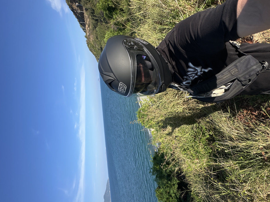 An individual is depicted in a daytime outdoor setting, positioned on an elevated, vegetated coastal embankment in Vĩnh Lương, Vietnam. The subject, seen from the chest up and angled slightly left, is wearing a matte black full-face motorcycle helmet with a clear outer visor and a dark inner sun visor, bearing an "EGO" brand logo on the left side. A black short-sleeved t-shirt with a white graphic design on the chest and a black fanny pack worn diagonally across the torso are visible. The subject's shadow, including a raised arm, is cast onto the foreground's dry, tall grass and sparse bushy vegetation. To the left, the deep blue-green ocean extends to the horizon, with a narrow rocky shoreline visible below the embankment. A distant landmass or island is present on the far left horizon. On the right, a steep, verdant hillside covered in vegetation ascends, revealing a road or path winding along its slope. The sky is bright, clear blue with minimal wispy clouds.