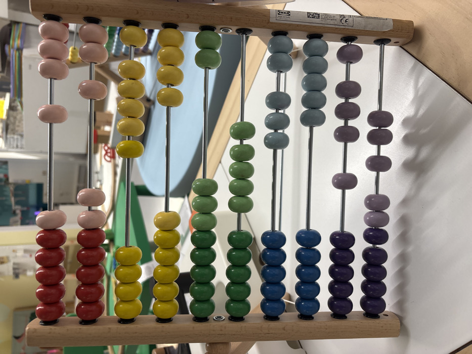 A colorful abacus with ten columns of beads is shown