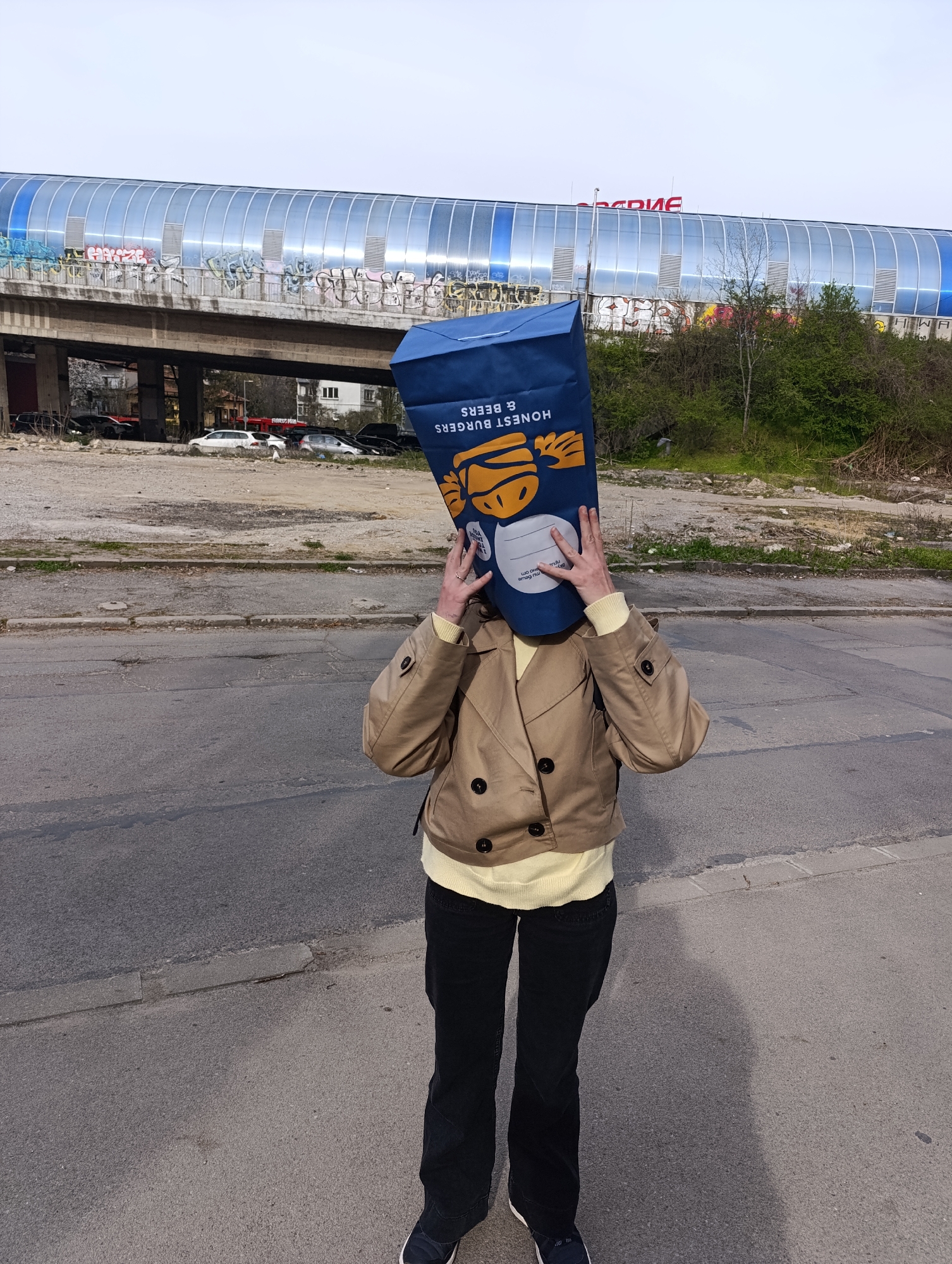 A person wearing a beige jacket over a yellow sweater and black pants stands on a gray paved surface with a blue "Honest Burgers & Beers" paper bag over their head, their hands raised to hold it in place. In the background, a raised glass and metal pedestrian bridge spans over a street with parked cars to the left, with a patch of greenery to the right. Graffiti is visible on the bridge supports. The background also shows a building with the word "ОСРИЕ" in red Cyrillic letters. This location appears to be in Sofia, Bulgaria.