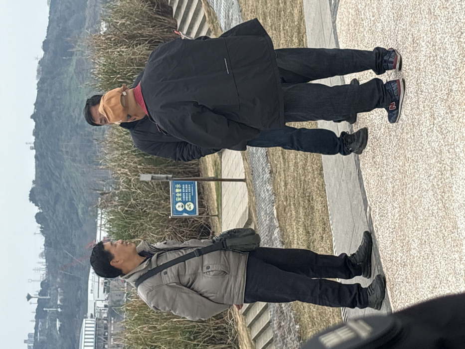 Three adult Asian males are engaged in conversation on an outdoor paved pathway in Banan, China, under an overcast sky