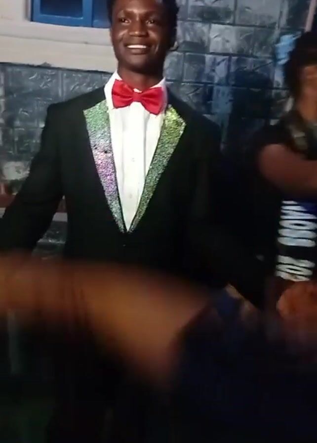 A person in a white and multicolored patterned shirt is hugging a person in a black suit with a red bow tie. The person in the suit is smiling and looking away, then looks up and smiles. The background features a wall painted to look like gray bricks with a blue window above. The person in the patterned shirt is partially obscured as they hug the person in the suit. The environment appears to be indoors with moderate lighting. There is music playing in the background.