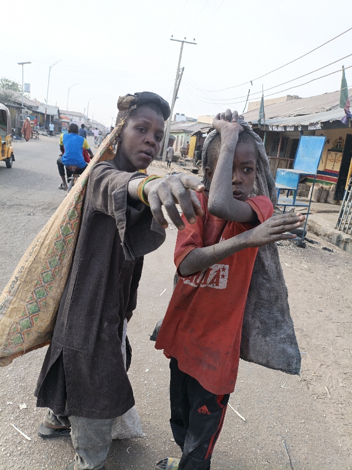 This image depicts two children on a dusty urban street in Gwagwarwa, Nigeria. The child on the left, an older adolescent, wears a dark, long-sleeved garment, light trousers, and brown shoes. A patterned beige and green fabric sack is slung over their left shoulder, extending down their back. Their right arm is extended forward, hand open with fingers splayed, and they wear multiple colorful bangles on their left wrist. Their face is directed towards the viewer, and their skin, especially on the extended arm, appears dust-covered. The child on the right, younger, wears a red t-shirt with a white graphic, dark track pants with red stripes, and patterned slide sandals. A dark grey sack is slung over their left shoulder. Their right hand rests on their head, and their left hand is partially extended forward. This child's exposed skin, including face, arms, and hands, is heavily coated in dust or fine particulate matter. Both children gaze directly towards the camera. The background shows a paved road with dirt shoulders. On the left, a yellow tricycle and a person on a bicycle in a blue shirt are visible further down the street. Utility poles with overhead lines and streetlights equipped with solar panels line the road. On the right, multiple single-story structures with corrugated metal roofs border the street, appearing as shops or residences. One structure has a bright blue plastic chair outside and a colorful mural. The ground is largely dirt and appears unkempt with some debris. The sky is pale and overcast.