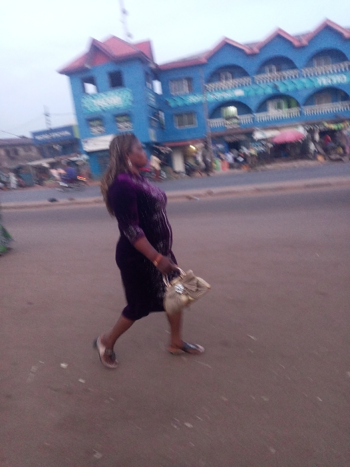 A woman in a knee-length purple velvet dress and sandals walks across an asphalt surface. She carries a light-colored, possibly sequined, handbag. A multi-story blue building with a red roof sits across the street, appearing to have storefronts along the base. People and shops line the street in front of the building. The sky is overcast, suggesting early morning or late afternoon lighting.