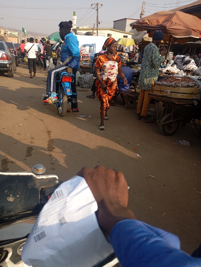 A vibrant street scene features a woman in orange clothing walking past a vendor with a cart laden with goods. To her left, a person with a distinctive hairstyle sits on a small blue motorcycle. The foreground shows the handlebars and a package held by the rider of another motorcycle, creating a first-person perspective. Other pedestrians, vehicles, and market stalls fill the backdrop, hinting at a bustling commercial environment under a sunny sky.