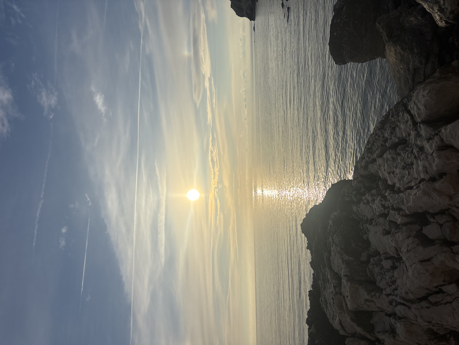 This image captures a coastal scene in Kruče - Kërruçi, Montenegro, during either sunrise or sunset. The sky, a gradient from light blue to yellow-orange near the horizon, contains scattered clouds and multiple white linear contrails. A bright, circular sun is positioned low on the horizon, slightly to the left of the image center, emitting a golden glow and creating a distinct, elongated reflection path (glitter path) on the water. A faint parhelion (sun dog) is visible to the right of the sun. The sea surface is calm with minimal ripples, reflecting the sky's colors. In the immediate foreground, dark, jagged rock formations with fractured surfaces occupy the lower left and central portions of the frame, largely silhouetted. A dark, rocky headland or cliff is visible on the far right, extending into the water. No individuals, animals, or discernible man-made structures are present.
