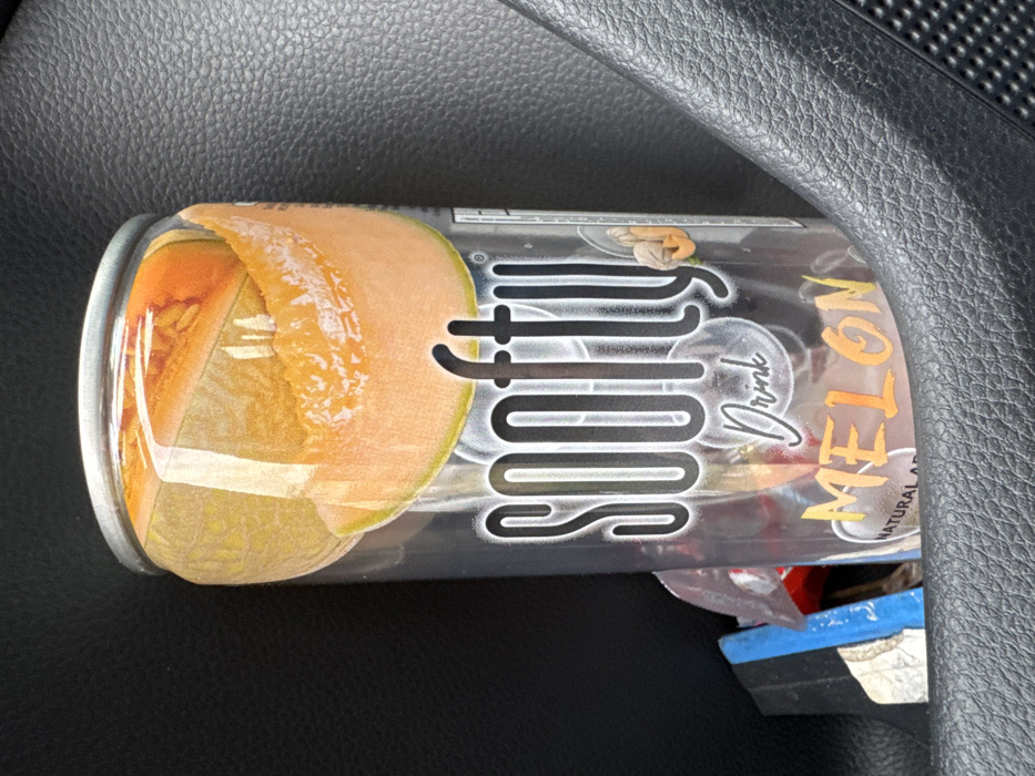 A "SOOFTY Drink MELON" flavored aluminum beverage can is positioned upright within a vehicle's interior, likely in a cup holder or door pocket