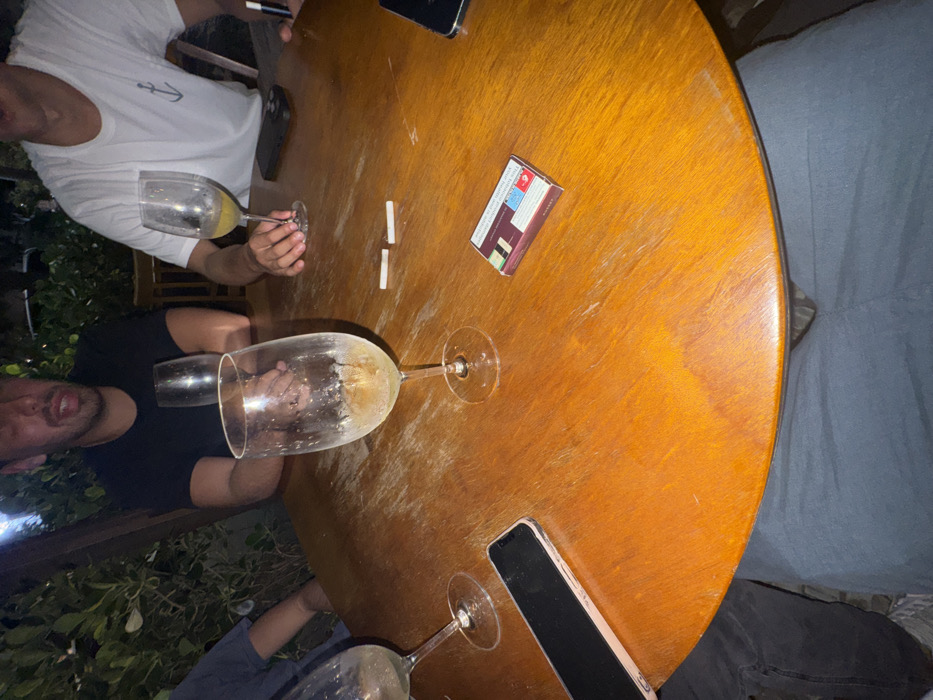 A round wooden table is surrounded by people. Wine glasses, some empty, others with liquid, are placed on the table. A pack of cigarettes and two individual cigarettes also sit on the table alongside two smartphones. People in various attire including a white t-shirt with an anchor emblem, a black shirt, and blue shirts are seated around the table. Part of an outdoor patio setting with plants is visible in the background.