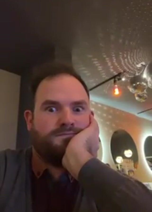 close-up of a man indoors, leaning his face into his hand. He has fair skin, a beard, and dark hair. He’s wearing a gray sweater over a collared shirt. Behind him, the ceiling is dark gray with a pattern of small white circles. There are also disco balls hanging and an orange lightbulb. On the wall behind him are three circular mirrors. There’s electronic music playing in the background. The man looks directly at the camera, then briefly glances to his left, then back at the camera.
