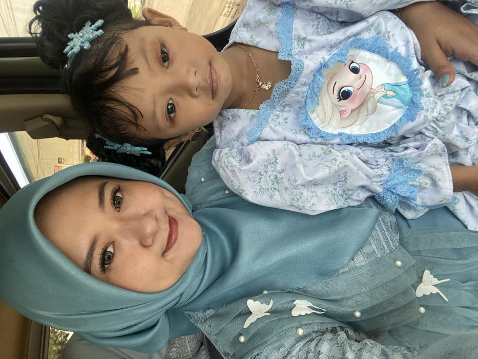 Two females are depicted in a close-up, waist-up portrait captured inside a vehicle in Pamotan, Indonesia. On the left, an adult female, aged approximately 20-30 years, wears a light teal hijab and a matching top adorned with white pearls and two white butterfly appliques with pearl centers. She has light makeup, including defined eyebrows and light brown lipstick, and smiles directly at the camera. Her right arm is visible, supporting the child. On the right, a young female child, aged approximately 3-6 years, is seated. She has dark hair styled in pigtails, each secured with light blue snowflake clips. She wears a light-colored dress with a subtle floral pattern and light blue lace trim, featuring a central circular patch depicting the character Elsa from Disney's *Frozen*. The child has small gold hoop earrings and a thin gold-colored necklace with a small pendant; her fingernails are painted light blue. Her gaze is directed slightly to the left of the camera. The background, visible through a vehicle window, shows blurred elements of an outdoor urban environment under bright daylight. The vehicle's interior, including a brown-tan panel, is visible around the subjects.