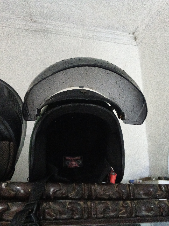In Ciherang, Indonesia, two motorcycle helmets are positioned on a dark, ornately carved wooden surface. The prominent helmet, located centrally, is a dark-colored full-face model with its clear visor partially raised. The visor's exterior surface exhibits numerous small water droplets. The helmet's exposed black interior lining reveals a red label with white text, including "WARNING" and a brand logo. A small red cylindrical object is attached to an internal strap on the helmet's right side. To the left, a portion of a second dark helmet with a textured mesh-like section is visible. The background consists of a plain white wall and ceiling, with a visible corner molding in the upper right. Slight discoloration is present on the wall surface near the corner. An unidentifiable small object rests on the wooden surface to the far right. No individuals or dynamic actions are depicted.