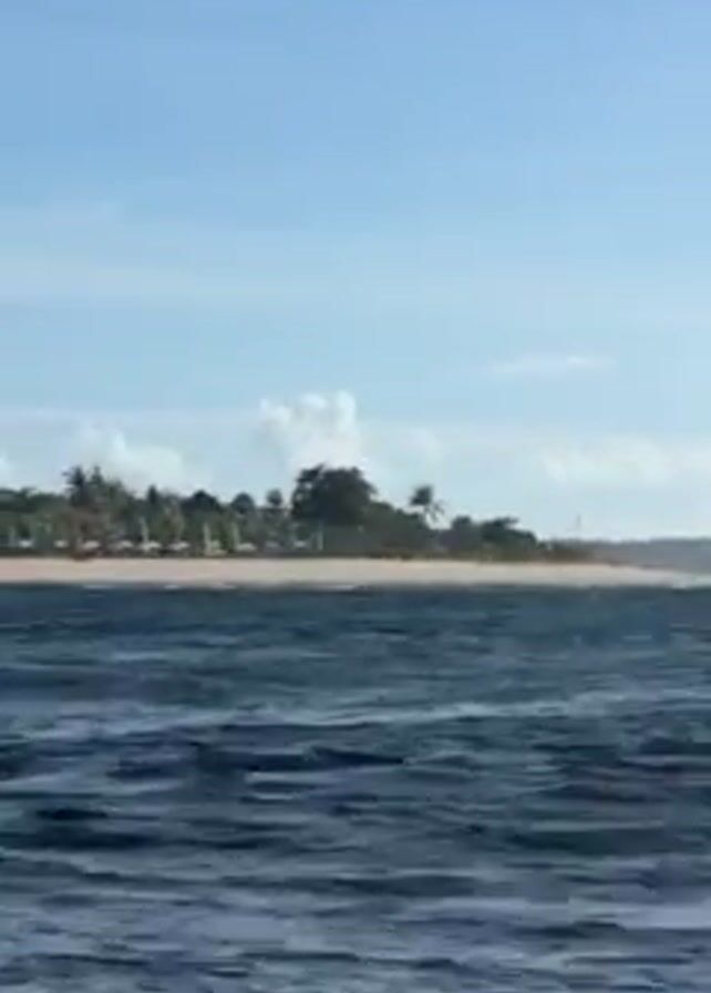 view from a boat at sea looking towards a sandy beach with trees and what appear to be beach umbrellas or canopies. The water is a deep blue and the sky is light blue with some white clouds. The camera is relatively stable.