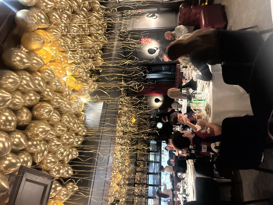 The image depicts the interior of a festive restaurant in Madrid, Spain. Hundreds of golden, metallic balloons densely cover the entire ceiling, with numerous long, curling golden ribbons hanging down. The restaurant features dark walls and a moderately lit ambiance with spotlights reflecting off the balloons. Multiple round dining tables, draped with white tablecloths, are arranged throughout the space. Each table is set with plates, cutlery, wine glasses, and water glasses. Seating consists primarily of dark chairs and some red upholstered banquette-style booths along the walls. Approximately 15-20 individuals are visible, either seated and dining or standing. In the foreground, two young males are seated at a table; one wears a dark jersey with "MESSI" and "10" on the back. They appear to be eating. In the mid-ground right, a woman with long brown hair is seated with her back to the viewer, and a bald man with a beard in a light-colored sweater is visible, facing left. In the background on the far left, a service or kitchen area is visible through a large opening, where several restaurant staff members are present, including one woman with her arms raised. People are engaged in eating, drinking, and conversation. Wall sconces provide additional ambient light.