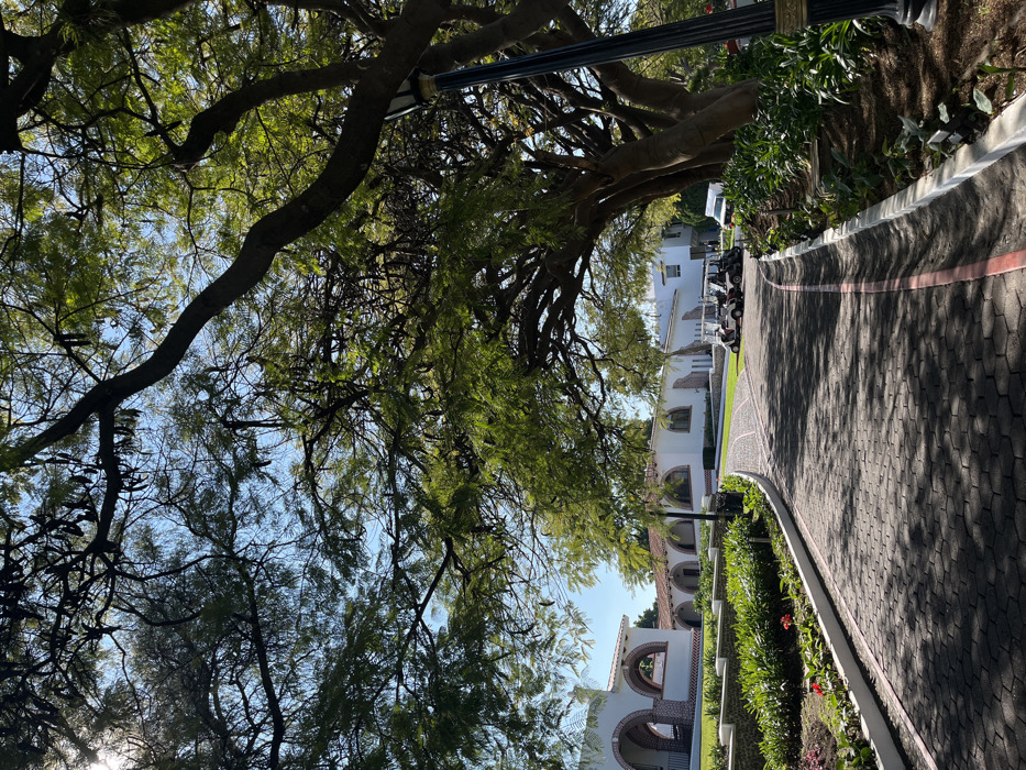 A serene outdoor scene showcases a cobblestone walkway curving gently between lush greenery and manicured lawns. The architecture features white buildings with arched details, possibly a residential complex. Above, a large, sprawling tree canopy provides shade, its branches reaching across the sky. The presence of parked golf carts indicates a recreational or resort setting, and sunlight filters through the leaves, creating dappled shadows.