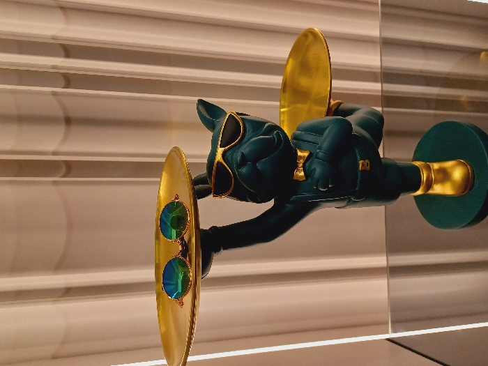 A close-up depicts a stylized sculpture, likely a decorative element, featuring a dark-green, cartoon-like cat figure wearing sunglasses with golden frames