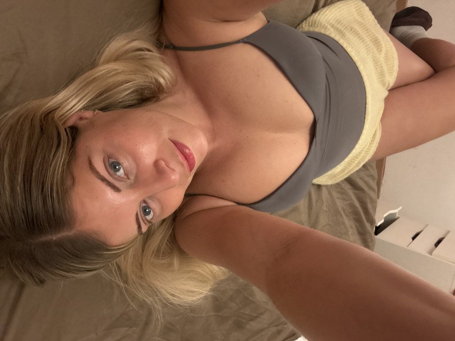A woman with blonde hair, blue eyes, and red lipstick is lying on a brown bed. She is wearing a gray tank top and beige shorts. She is looking directly at the camera, which appears to be angled from above. Part of her arm is visible in the lower right of the frame. There is a white cabinet visible in the lower right corner of the background. Her face is well-lit.