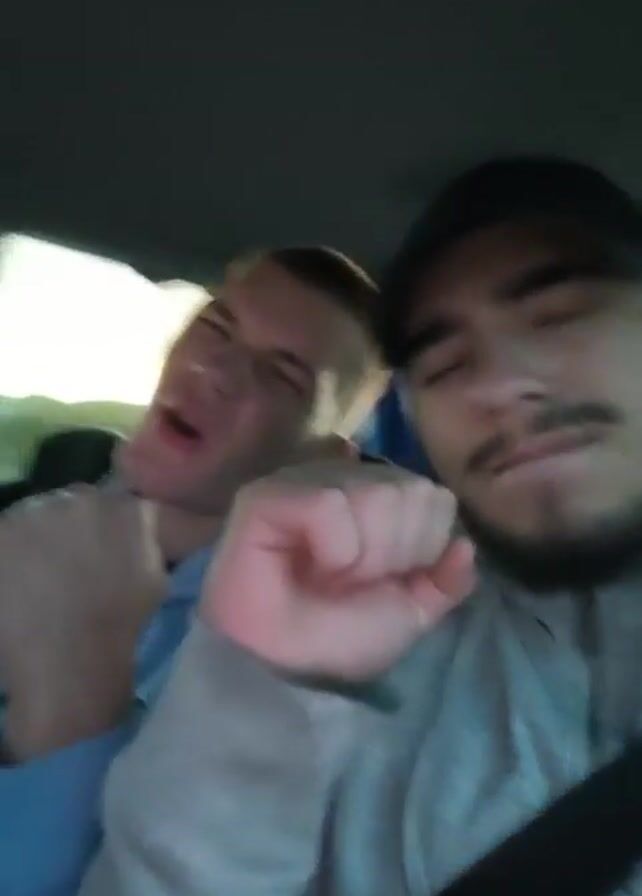 Two men are in the front seats of a car, both wearing hoodies and seatbelts. The man on the left has a short buzz cut and is singing while gesturing with his fist. The man on the right has a beard, is wearing a baseball cap, and also appears to be singing. A landscape is visible through the window.